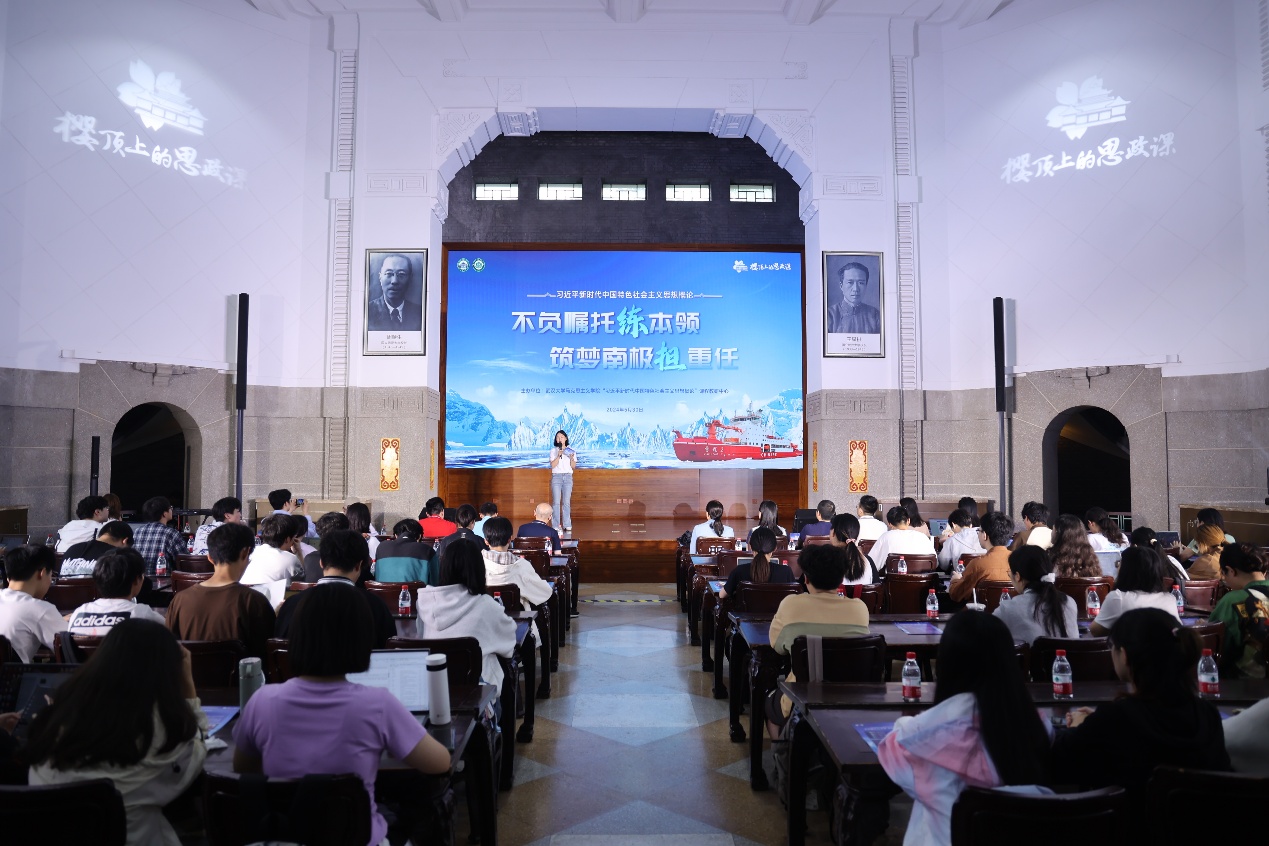 参加中国南北极科学考察的师生代表王泽民教授、褚馨德博士、耿通博士现场授课,中国南极中山站站长胡泽骏校友线上展示。全校2022级近7000名本科生通过“线上+线下”相结合的方式同上一堂“樱顶上的思政课”。