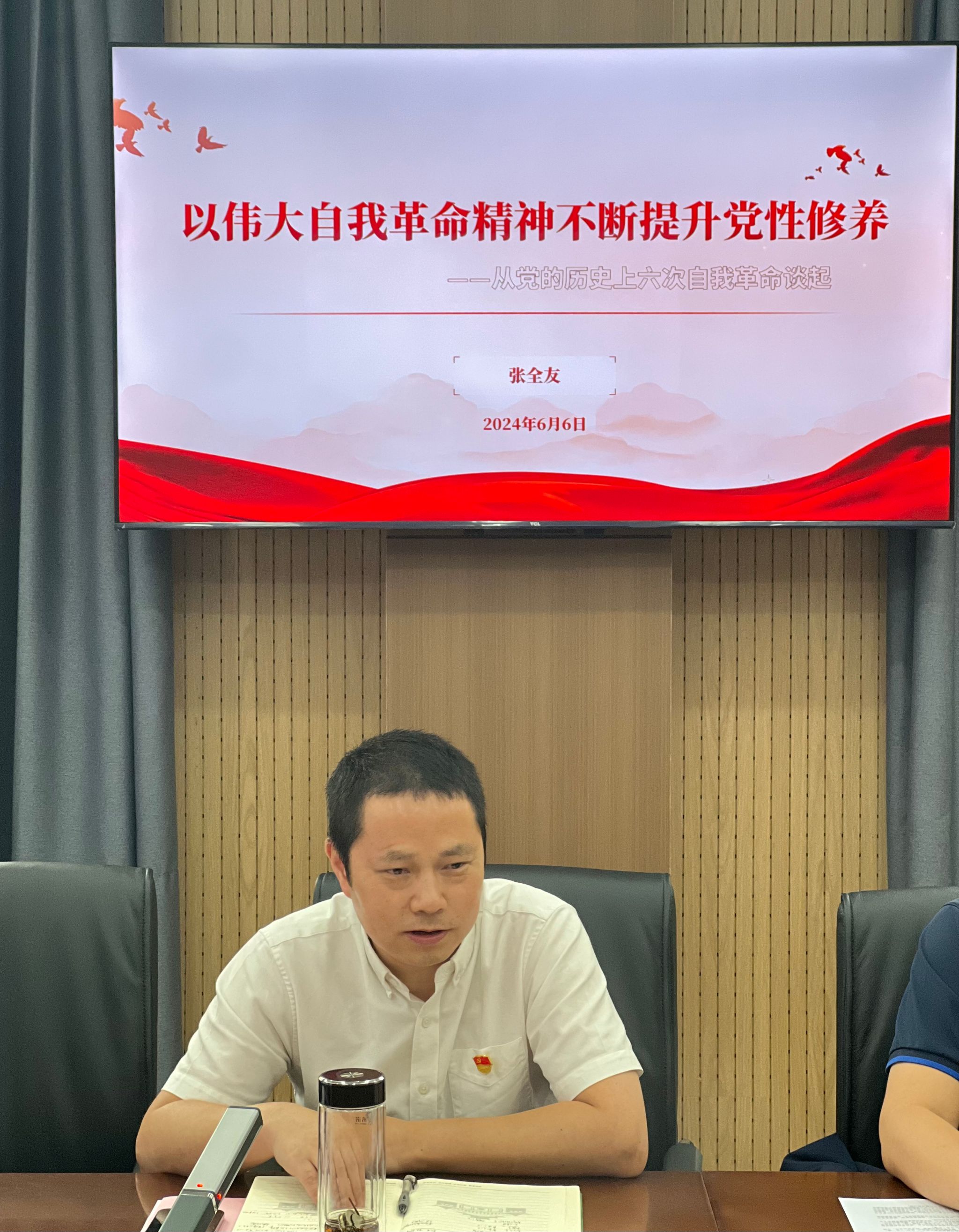 张全友以“以伟大自我革命精神不断提升党性修养——从党的历史上六次自我革命谈起”为主题讲授党课。他从自我革命的基本内涵、百年党史最具历史意义的六次自我革命及如何以深刻的自我革命精神不断提升党性修养三个方面进行了深刻阐述。他指出,敢于直面自身存在的问题,勇于自我革命,始终保持先进性和纯洁性,不断增强创造力、凝聚力、战斗力,永葆马克思主义政党本色,这就是我们党自我革命的基本内涵。他强调,当前形势下,党员干部必须以深刻的自我革命精神,通过以下四个方面不断提升党性修养:坚持自我净化,永葆坚定忠诚的政治品质;坚持自我完善,追求纯洁高尚的道德境界;坚持自我革新,淬炼斗争创新的精神品质;坚持自我提高,提升履职担当的素质本领。