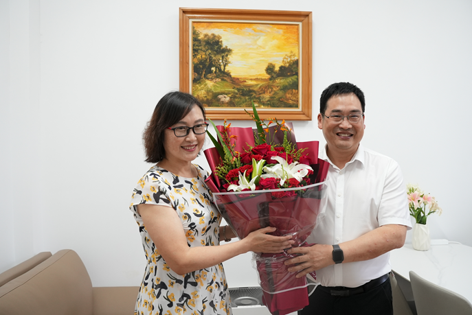 楚龙强一行来到杨军教授办公室,代表学校向杨军教授致以节日的问候并送上鲜花,殷切关心她的日常生活、教学及科研工作情况,对她一直以来站稳三尺讲台、为学校学科发展和人才培养作出的突出贡献表示感谢,勉励她继续为学校和学院发展贡献智慧和力量。杨军教授对学校的关心慰问表示感谢,并就学校思政课内涵式发展与课程思政高质量建设提出了建议。