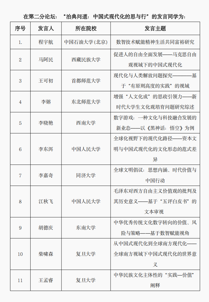 、山东大学、南开大学、四川大学、中南大学等高校的90余位师生代表围绕“习近平文化思想的承与启”、“中国式现代化的思与行”、“党在基层工作的守正创新”等议题,进行了分享交流。PO18