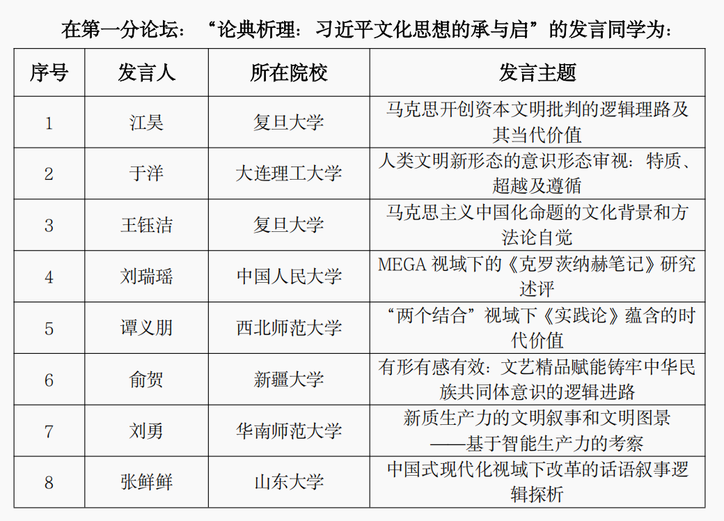 博士生冶双良、王志伟主持,共8位参会人员发言。论坛围绕习近平文化思想的理论渊源、核心要义和实践指向等论题展开讨论,参会人员畅谈观点,气氛热烈。