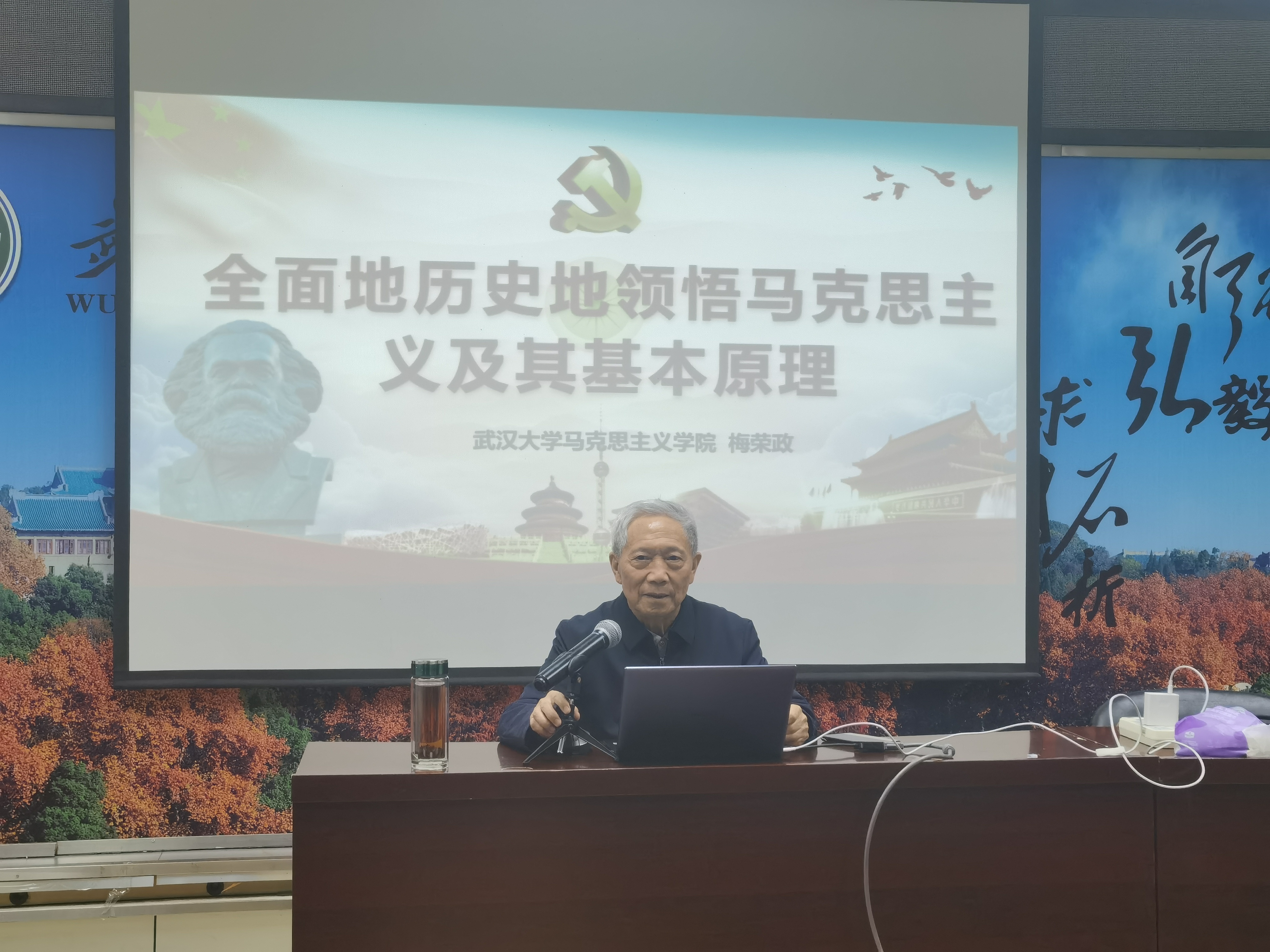 梅荣政教授紧紧围绕主题主线,层层递进,从四个方面为学生们进行了阐释:一、什么是马克思主义。二、什么是马克思主义基本原理。三、有关马克思主义及其基本原理需要澄清的若干问题。四、如何从马克思主义经典著作中领悟马克思主义基本原理。讲座中,梅荣政教授旁征博引,资料详实、内容丰富、概念清晰、逻辑严密,系统地引证和解读了马列主义经典作家及我党历任主要领导人之所述,使在座的师生清楚地认识到马克思主义及其基本原理的科学性和革命性、基础性和根本性、整体性和层次性、稳定性和发展性等等特征。