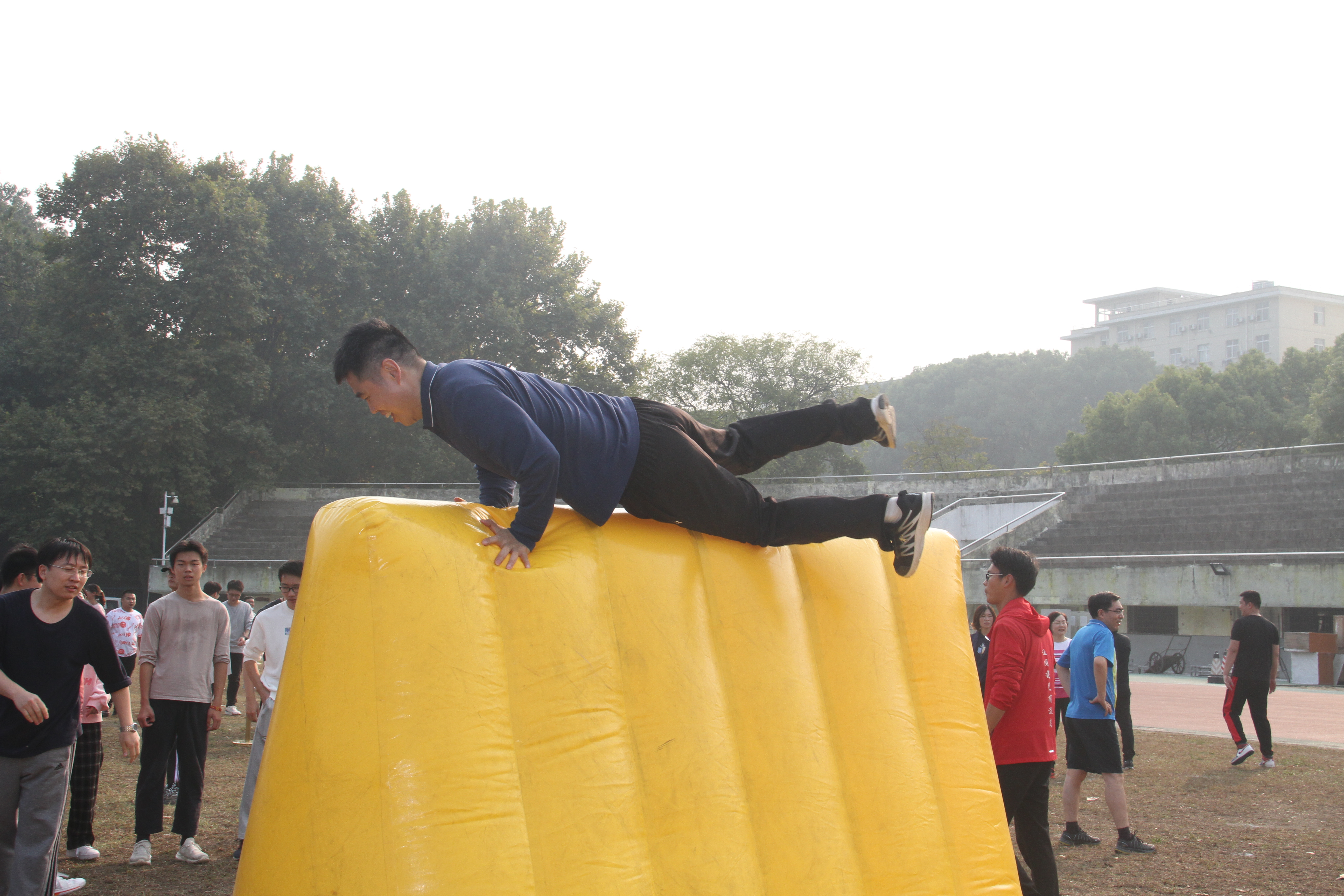 第六个项目是奔跑的小巨人。指压板赛道两端各有四名队员,两端的队员穿上小巨人服装同时出发,到中点击掌后返回各自起点,将服装传递给下一位队员,以此类推,最终用时较短的队伍获胜。