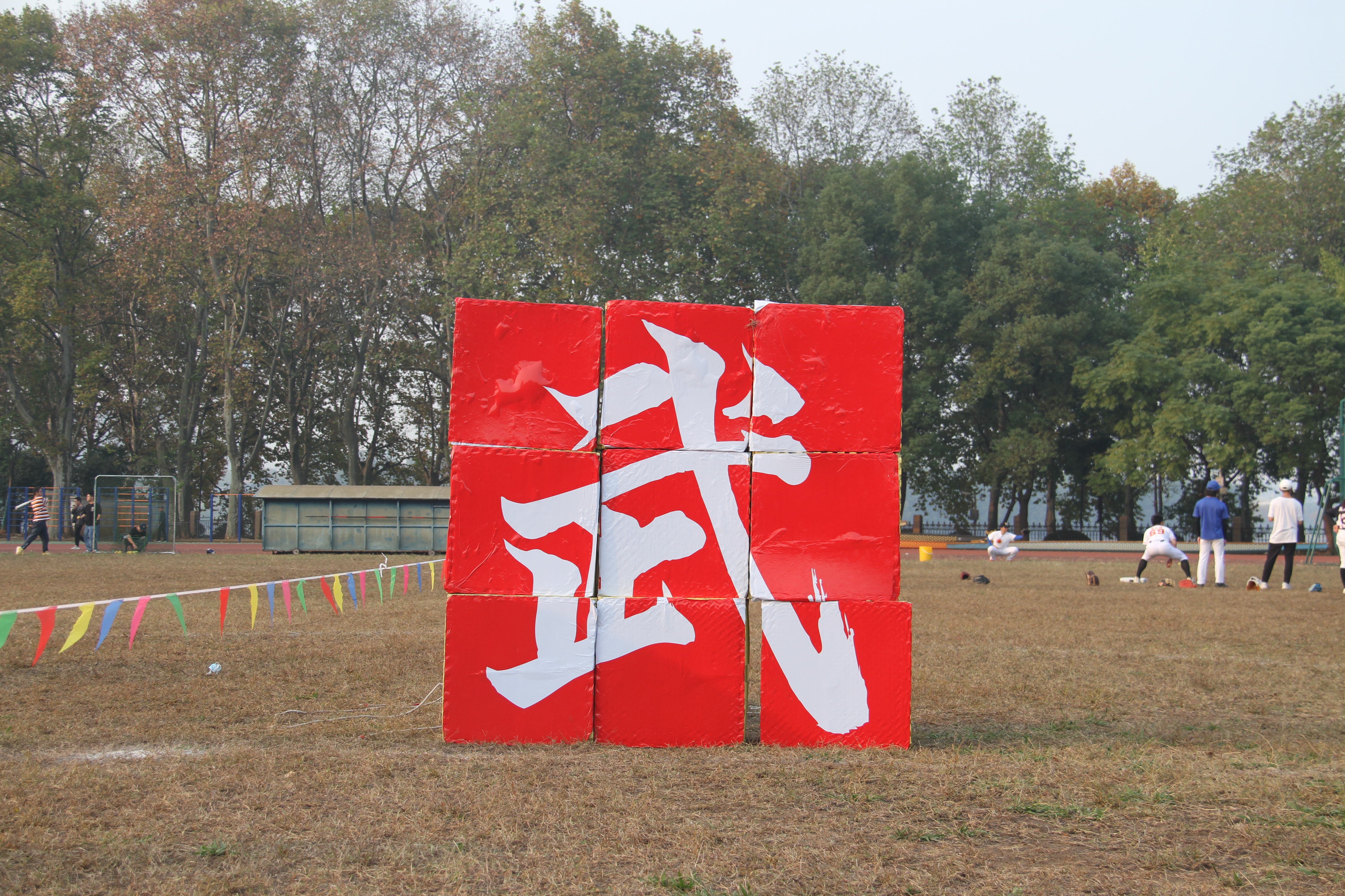 的“武”字被切分成九份贴在九个方块上,运动员轮流从起点出发将方块运送到指定地点,直到最后一名队员将最后一个方块送达,并完成文字拼图。这一项目看似简单,实际上不少队伍还是花费了九牛二虎之力才完成拼图。