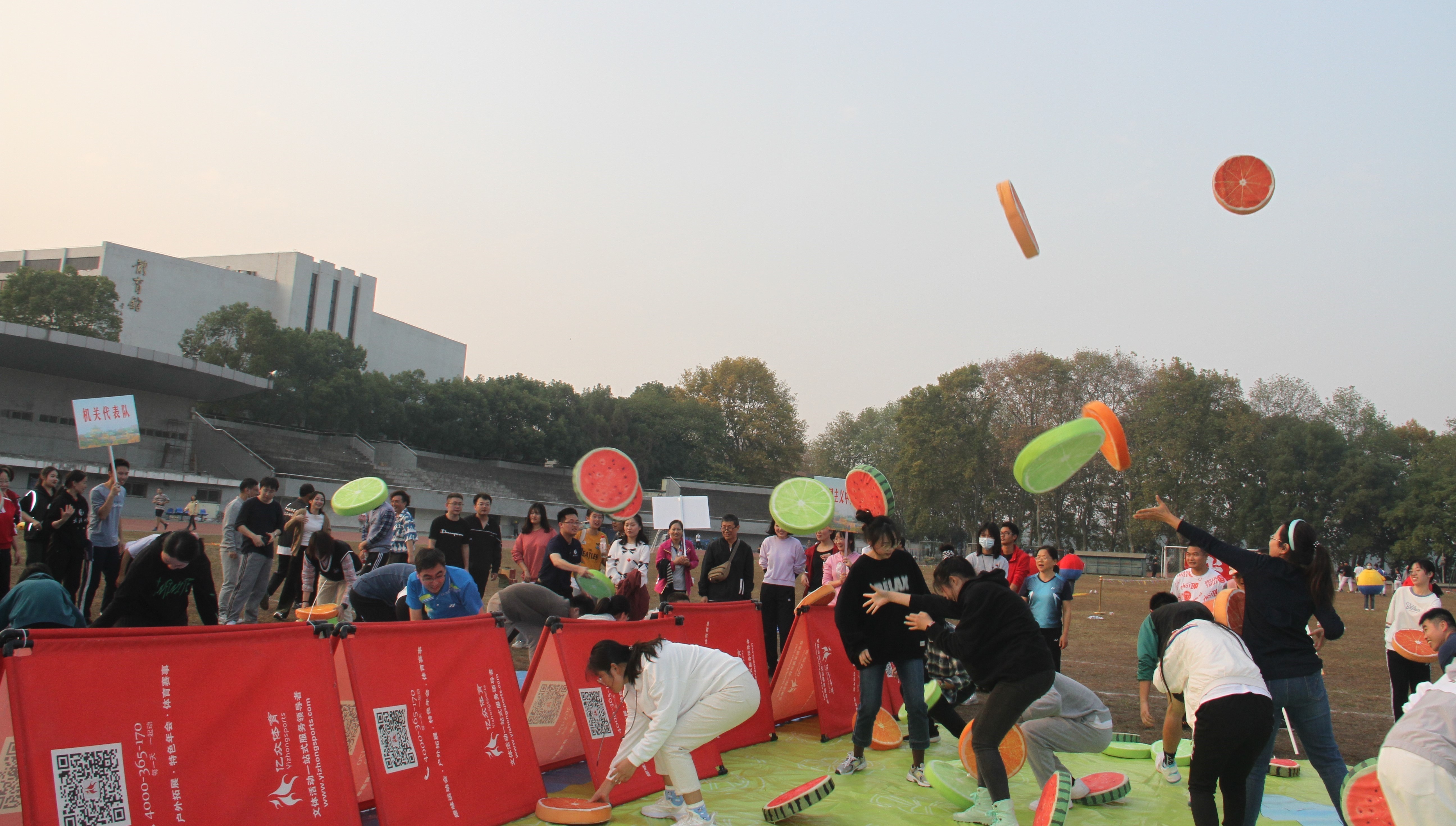 最后一个项目是运动会的高潮——水果大战。运动员将己方区域的水果枕头扔到对方区域,三分钟后所在区域枕头个数少的队伍获胜。大家片刻也不停歇,运动场上枕头与欢声笑语齐飞,场面十分热烈。