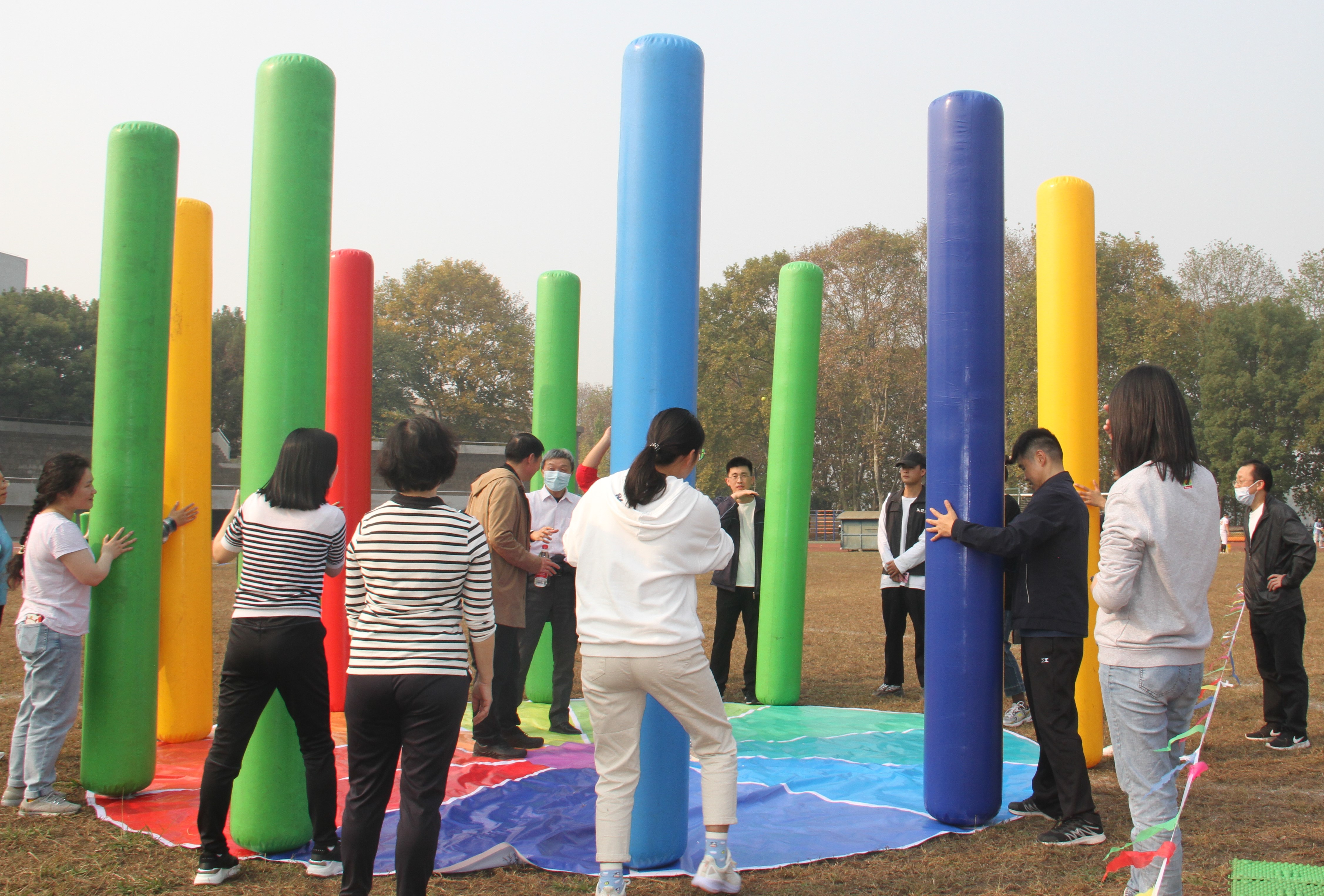 下一个项目是薪火相传。队员们围成一圈,使各自的充气棒保持直立,当负责指挥的队员喊“换”时,同时移动位置,与相邻队员交换充气棒而不使其倒下。这一项目十分考验队员的速度与协作。