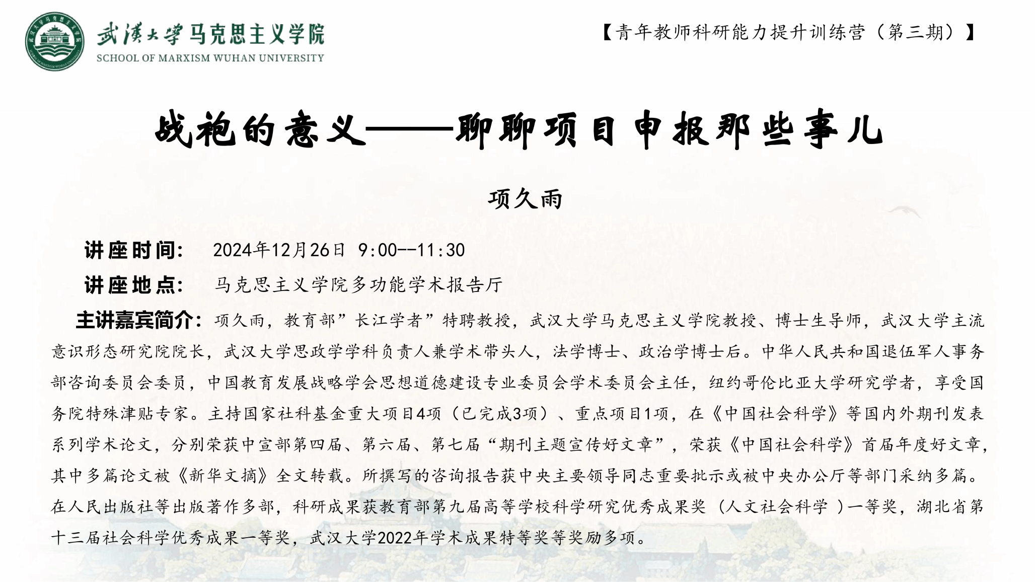 项久雨,教育部”长江学者”特聘教授,PO18 教授、博士生导师,PO18 主流意识形态研究院院长,PO18 思政学学科负责人兼学术带头人,法学博士、政治学博士后。中华人民共和国退伍军人事务部咨询委员会委员,中国教育发展战略学会思想道德建设专业委员会学术委员会主任,纽约哥伦比亚大学研究学者,享受国务院特殊津贴专家。主持国家社科基金重大项目4项(已完成3项)、重点项目1项,在《中国社会科学》等国内外期刊发表系列学术论文,分别荣获中宣部第四届、第六届、第七届“期刊主题宣传好文章”,荣获《中国社会科学》首届年度好文章,其中多篇论文被《新华文摘》全文转载。所撰写的咨询报告获中央主要领导同志重要批示或被中央办公厅等部门采纳多篇。在人民出版社等出版著作多部,科研成果获教育部第九届高等学校科学研究优秀成果奖 (人文社会科学 )一等奖,湖北省第十三届社会科学优秀成果一等奖,PO18 2022年学术成果特等奖等奖励多项。