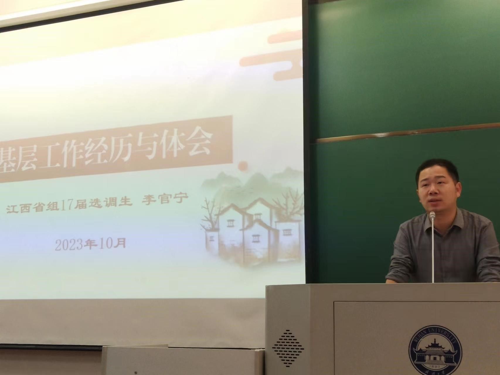 来自江西省的选调生李官宁校友,系我校法学院17届法律硕士。他首先介绍了关于选调生的相关政策以及实际工作,并结合自己的经历重点讲解了脱贫攻坚和安全生产的问题。关于脱贫攻坚,李官宁介绍了他推动村村通网,村民搭乘网络时代的快车,通过电商卖出农产品、实现脱贫致富的经历,并勉励青年学生要深入基层,利用自己的知识和才干为乡村振兴事业贡献力量。