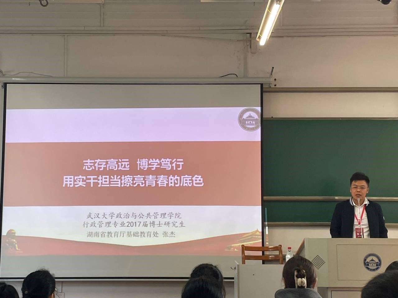 来自湖南省的选调生张杰校友,系我校政治与公共管理学院2017届毕业生。他结合自己的基层工作经历,重点讲解了选调生们在教育帮扶工作中的不懈努力和奉献精神,并介绍了其带领下“爱心+扶志教育帮扶模式的形成历程,指出这一模式不仅仅关注物质帮助,更着眼于激发学子们的内在潜力与志向。张杰还就青年学生关心和关注的乡村非遗工艺的传承与保护等问题作了分享与回应。