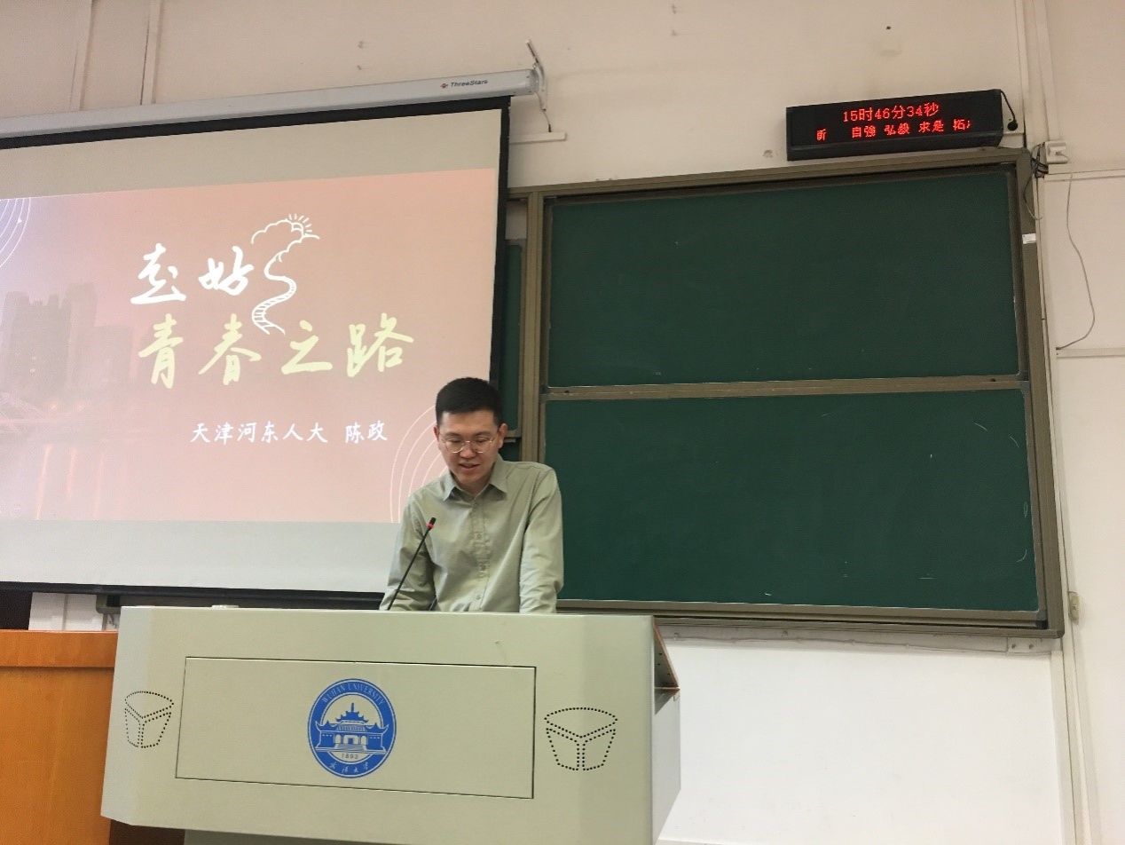 来自天津市的选调生陈政,系我校2020届硕士毕业生。他首先简要介绍了天津市基本情况,进而结合自身工作经历和实际状况,详细介绍了新时代基层社区治理、基层民主政治建设、新时代中国青年的责任和担当等问题。他认为,作为选调生和青年干部,要俯下身子、融入群众,为群众办实事、解难事,在服务人民中实现理想、增强本领。