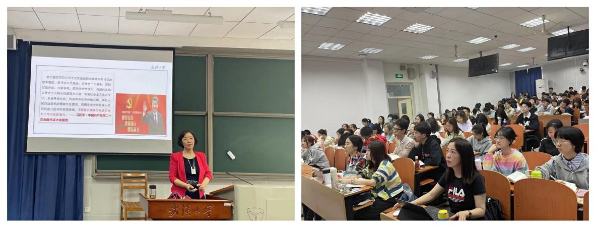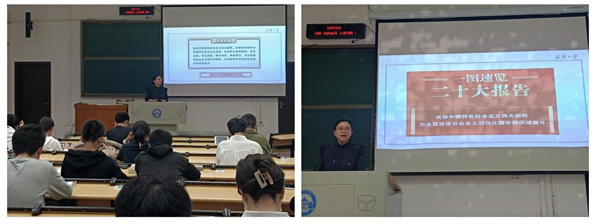 丁俊萍教授是在珞珈山上从事思政课教学达40年的国家教学名师,她作为“毛泽东思想和中国特色社会主义理论体系概论”课程中心负责人,在党的二十大召开的当天晚上,就组织课程组全体教师通过腾讯会议进行集体备课,主题就是如何在第一时间把习近平总书记在大会上的政治报告精神融入课程教学之中。