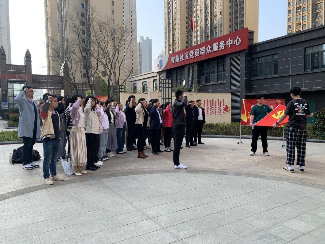 活动最后,马院师生和智苑社区的工作人员们一起来到习近平总书记与居民亲切交谈的社区广场,面向党旗,举起右手,庄严宣誓,铮铮誓词,声声入耳。师生们也必将践行入党誓词,坚定信念,奋勇前行。
